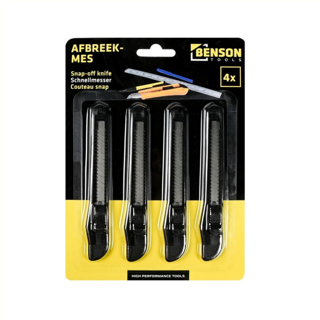 • Een handig afbreekmes voor hobbyisten dat geschikt is voor uiteenlopende snijklussen in en rondom het huis • 4 Stuks • Kunststof en staal • Mesvergrendeling • Verwijderbare breekkap