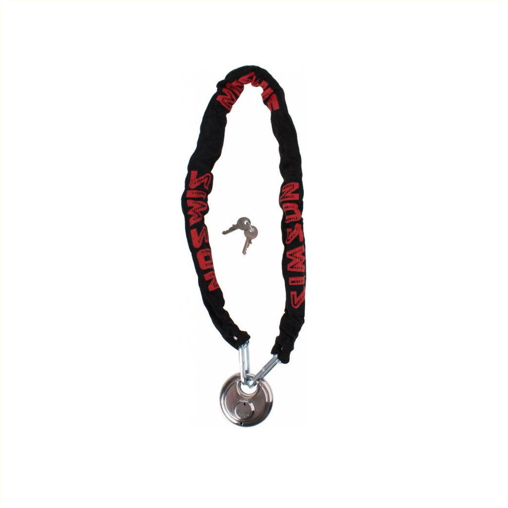 Het Simson Kettingslot Strong size L is een veilig zwart-rood kettingslot van 5,5mm dik. • Met een lengte van 1 meter is het slot handig mee te nemen op de fiets. • De ketting wordt geleverd met een robuust discusslot en twee sleutels.