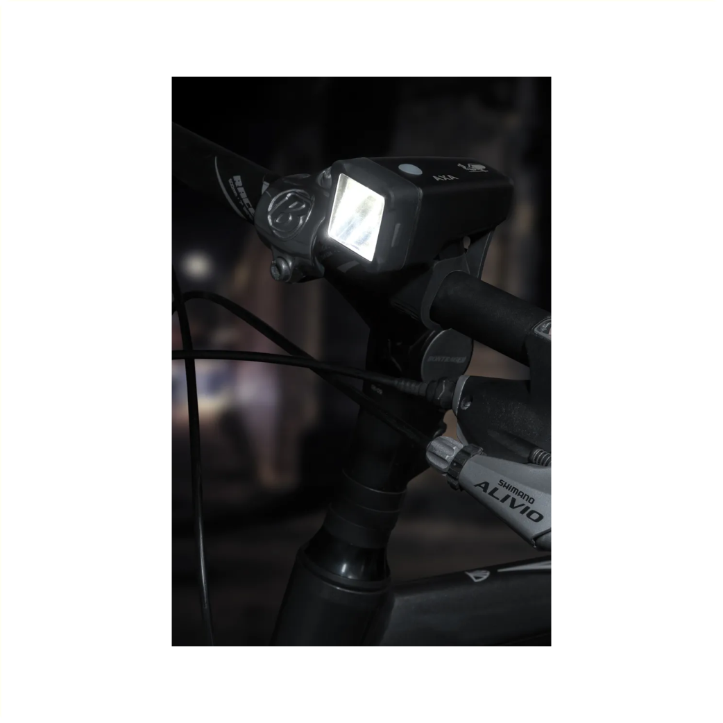 De AXA Niteline T1 is een set van een torch voorlicht dat werkt op AAA batterijen en achterlicht dat werkt op CR2032 batterijen.