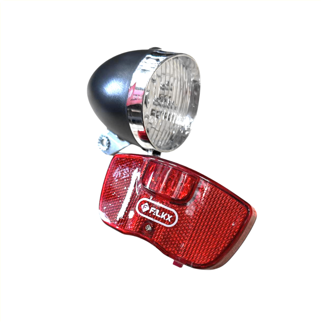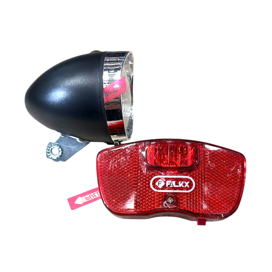 Zorg dat je van alle kanten goed zichtbaar bent met de FALKX Sun Set 1. Deze complete verlichtingsset is de ideale upgrade voor je stadsfiets of transportfiets, bestaande uit een krachtige retro-stijl koplamp en een robuust achterlicht voor je bagagedrager.