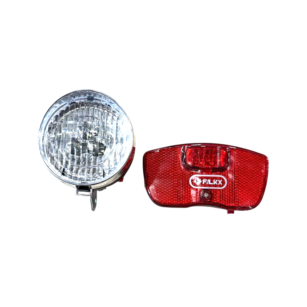 De FALKX Sun Set 1 combineert klassiek design met de moderne betrouwbaarheid van LED-techniek. De set bevat een opvallende "bullet" koplamp (voor op de voorvorkbeugel) en een breed achterlicht dat perfect op de bagagedrager past. Beide lampen werken op batterijen, waardoor je altijd verzekerd bent van een constante lichtstraal, ook als je stilstaat.